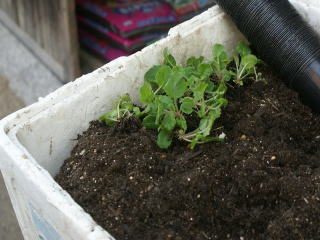 メランポジウムのこぼれ種がパンジーの合間から本葉をのぞかせています。15ポットほどとりました。おそらく、パンジーをとってしまうとすぐにメランポが成長してきます。いつもは5月連休後に発見しますが、2週間早いと思います。