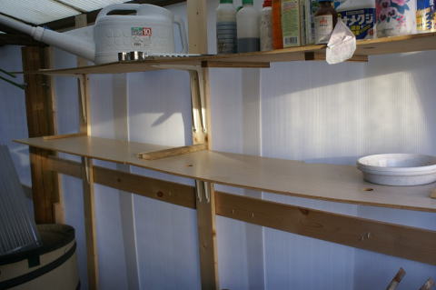 温室に廃材を使って棚をつりました。薄いベニヤ板なので重い物はのせられません。温室というより倉庫との兼用になりそうです。