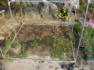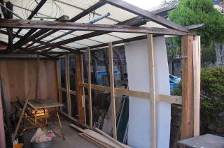 温室を作り始めました。といっても、密閉する場所ではなく、屋根と寒さをよける壁らしい物がある程度です。