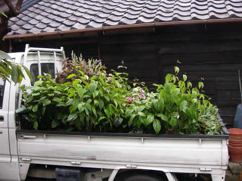 大型台風が近づいてくるため庭にある苗と鉢を片付けました。鉢の多くは軽トラックに乗せ、残りは屋根のある場所へ移しました。苗は、軽トラックの車庫の中にブルーシートを敷き詰めて並べました。花を育てている者の宿命です。台風が通り過ぎた朝か土曜日に元の位置へ戻します