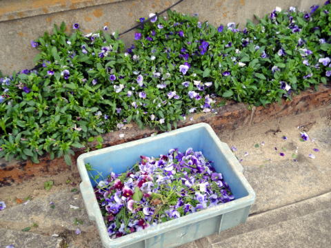 パンジーの花は最盛期ですが、花摘みをしました。いずれ花が弱くなってくるので、種をつける前にほと