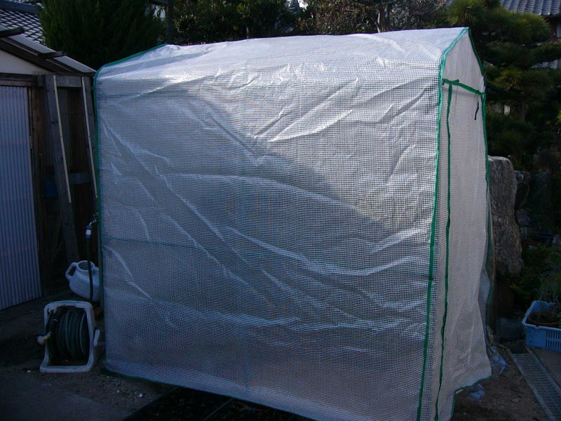 ゲンペイカズラを入れるための温室を設置しました。枠だけはそのまま放置しておいたのでビニールカバーのみとなりましたが、チャックが一か所不良で、1週間前にかぶせたものの不備でした。そのための補修をしてやっと完成となりました。