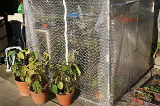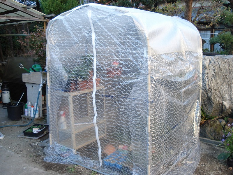 昨年自作した温室を再設置しました。温室といっても全くの簡易な物で、とりあえず寒さを防ぐだけの物です。古いむしろを3枚敷き、その上に木製の温室を設置です。本当は軒下に置きたいところですが、よい場所がないため庭の片隅です。