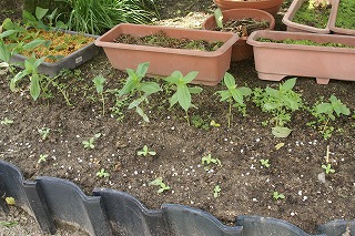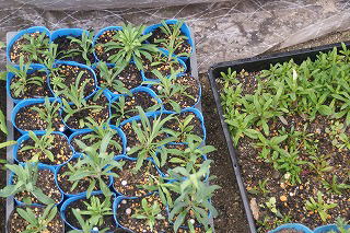 いろいろな苗が急に生長してきました。ポット取りをしました。近所の方々に苗をあげました。ポットの下から根が出てきたら植え頃ですよと言って差し上げました。