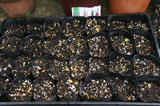 7月末に蒔いたサクラソウの苗がかなり大きくなってきました。大きいものを苗箱からとってポットに移植しました。まだ小ぶりなものはそのままにしてIB化成をまいておきました。2週間後にまたポット取りになります。