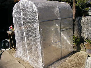 既製品の温室は2−3回買いましたが、1年で壊れます。もちろん安いからです。そこで、昨年度思い切って作りました。今年も役に立ってくれると思います。
